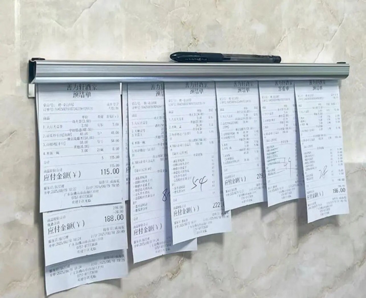 去店里吃饭应该都见过这画面,一张张外卖单夹着,店员手飞快的换着,单子还整整齐齐的。