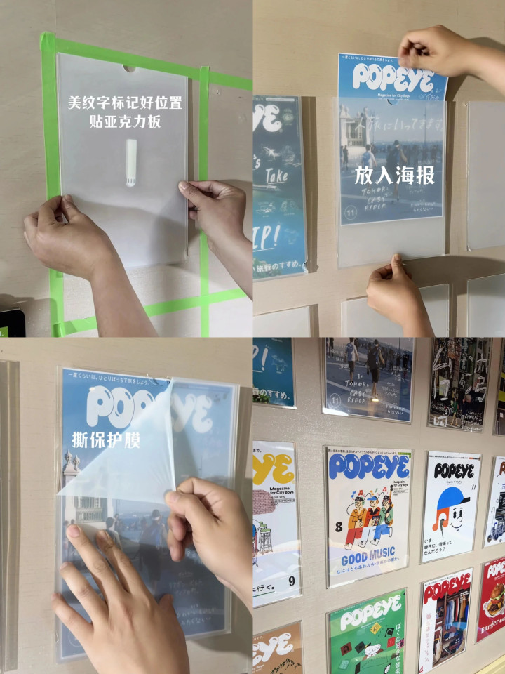 说干就干,准备好亚克力板子和卡槽、照片、美纹纸,先用美纹纸在墙上定出框线,亚克力卡槽按照标记好的位置上墙,把照片塞进去,撕掉保护膜,依次排列好就完成啦!