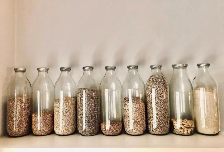 很多人买牛奶,喝完的玻璃瓶加个小瓶塞装五谷杂粮,密封性好,而且全透明颜值也不错!