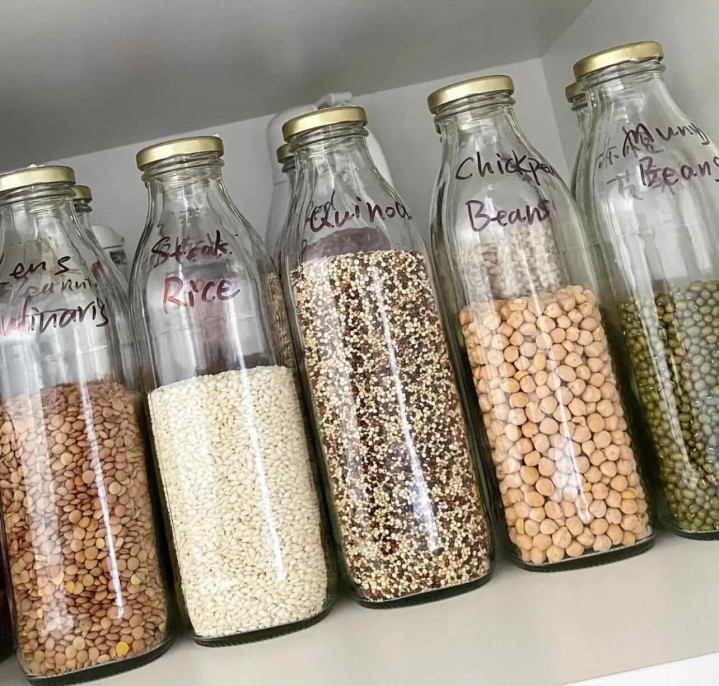 有个简单省钱的办法,直接搜“商用牛奶瓶”,装豆子、小米、杂粮防潮又好看,装食材放心,还能用马克笔在上面写字,区分的明明白白。